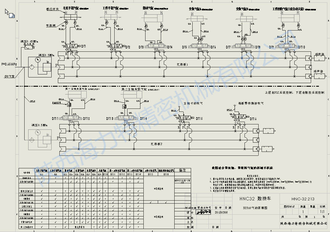上圖是我司開發(fā)的HNC-32系列自動控制,氣動原理圖。公司采用較為先進的設計理念,對每個動作用邏輯圖驗證,保證運動的合理可靠性。