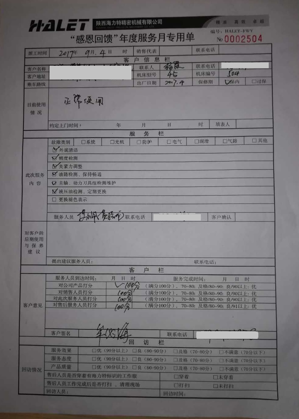 2017年9月,“感恩回饋,用心服務”海力特第三屆年度服務月拉開序幕,各組服務人員深入客戶現場認真檢修機床,用心服務客戶。真正做到讓客戶滿意,得到新老客戶的一致好評。
